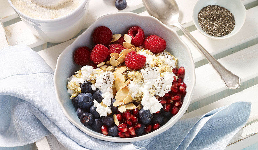 • Frischkäse unter die Haferflocken heben und mit den Himbeeren, Heidelbeeren und Granatapfelkernen in einer Bowl anrichten. Mit gerösteten Mandelblättchen und Chiasamen bestreuen.