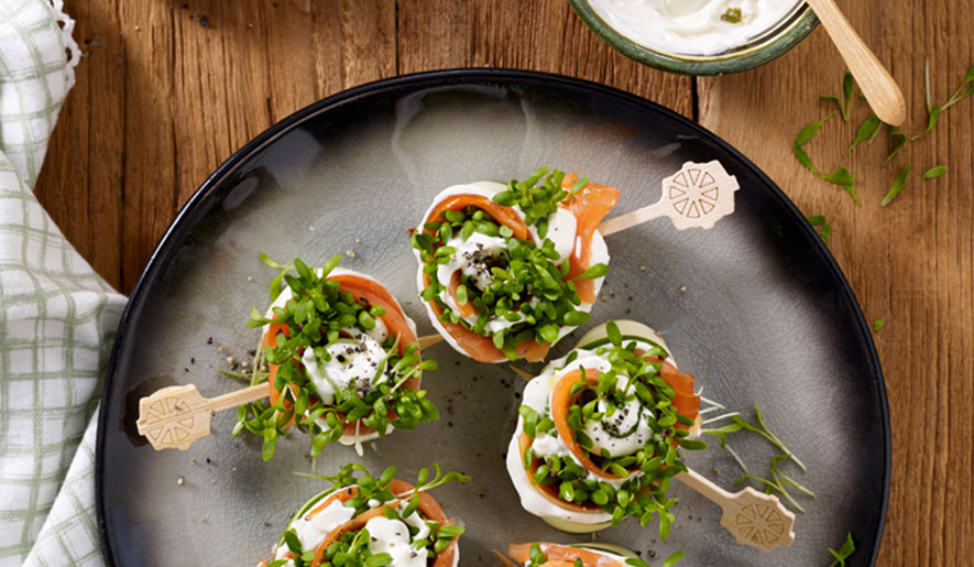 • Gurkenscheiben nebeneinander auf eine Arbeitsfläche legen. Die Gurkenscheiben jeweils mit 2 TL Exquisa Joghurt Kräuter bestreichen und jeweils mit 1/2 Lachsscheibe belegen. Kresse vom den Beeten schneiden und auf die belegten Gurkenscheiben streuen.